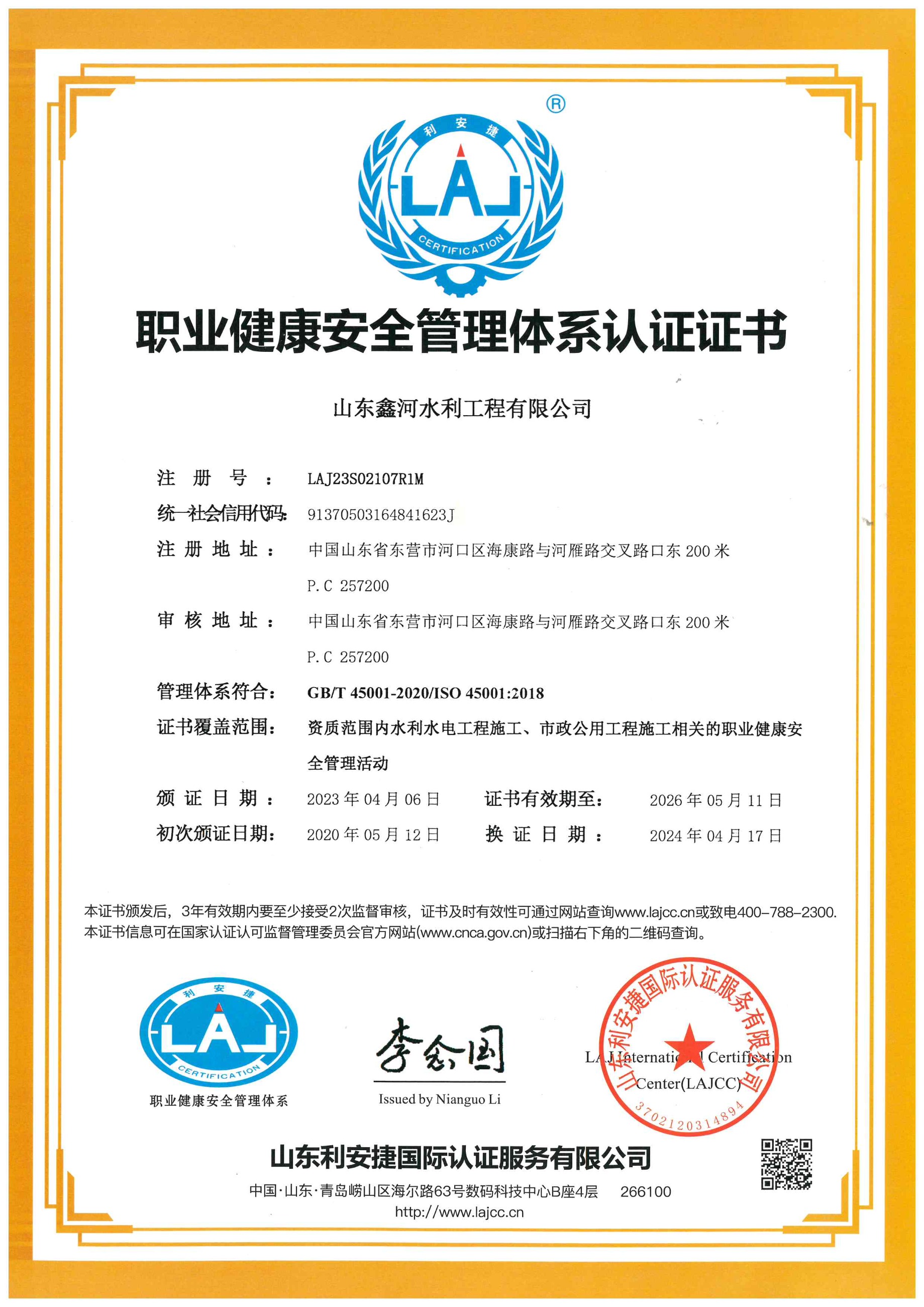 職業(yè)健康安全管理體系認(rèn)證證書(shū)